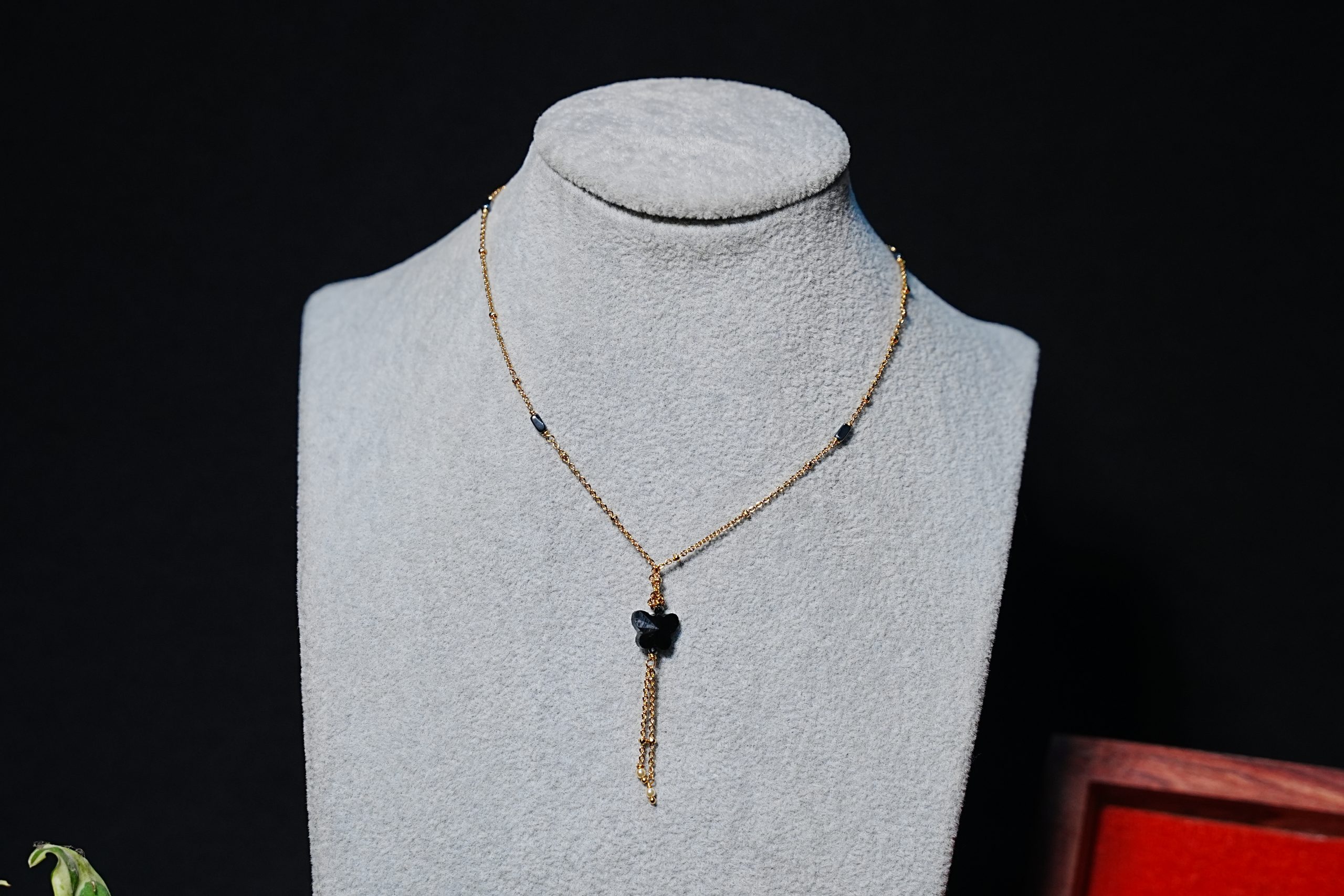 Be the first to review “Fashioned black bead chain with hanging black butterfly”